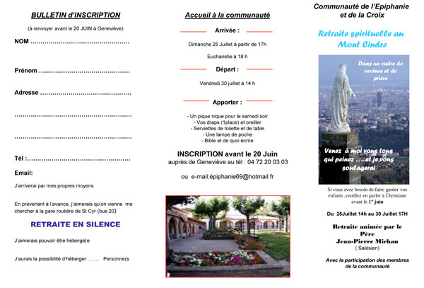 Une pause annuelle de 5 jours vous est proposée pour une retraite spirituelle en silence, tout en profitant des sentiers du Mont Cindre. Elle a lieu généralement en fin juillet ou début aout.Nous contacter pour plus de renseignements...